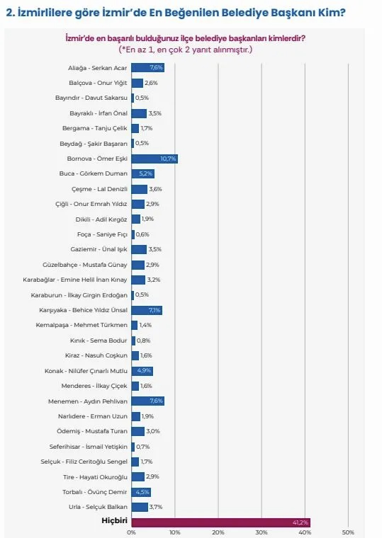 Anket sonuçlarının ayrıntılarına bakıldığında, ilçe belediye başkanları arasında on virgül yedi oran ile birinci sıraya yükselen Eşki’yi farklı ilçelerden yöneticiler izledi. Sıralamada Aliağa Belediye Başkanı Serkan Acar, Menemen Belediye Başkanı Aydın Pehlivan ve Karşıyaka Belediye Başkanı Yıldız Ünsal gibi isimler ön plana çıktı. Raporun genel değerlendirmesinde ayrıca Buca Belediye Başkanı Görkem Duman, Torbalı Belediye Başkanı Övünç Demir ile Konak Belediye Başkanı Nilüfer Çınarlı Mutlu gibi isimlerin de seçmen nezdindeki beğeni oranlarının yüksek çıktığı ifade edildi.